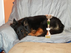 12.11.2011- a je to doma. Dnes Ennie v konkurenci 5 fenek ve třídě otevřené získala svého posledního CACe a tím splnila podmínku pro získání titulu Český šampion. Každý CAC je od jiného rozhodčího a mám velkou radost, že na poslední výstavě sezony se nám to povedlo. Ennie na to měla svůj názor, což je vidět na fotce:-). Asi tak moc ji ten poslední CAC zajímal. Výstavy se zúčastnilo i pár Ennie příbuzných z Boršova , teta Darka získala ve třídě vítězů V2 Res CAC, babička Dara ve veteránech V1 a kamarád Xavi ve třídě otevřené také V2 Res CAC. Fotografie z výstavy jsou ZDE